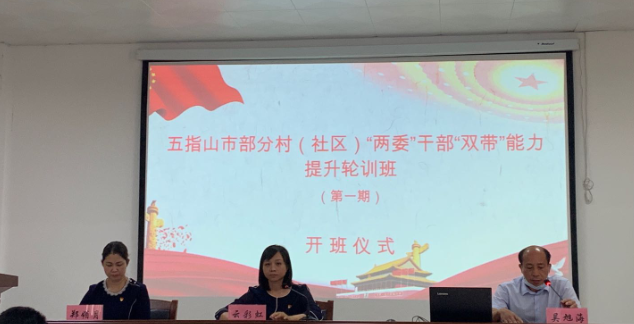 4月13日上午,五指山市委组织部、五指山市委党校联合举办的五指山市部分村(社区)“两委”干部“双带”能力提升轮训班(第一期)在五指山市委党校开班。五指山市委组织部副部长、市委非公有制经济组织和社会组织工作委员会书记云彩虹,五指山市委党校常务副校长郑媚月出席开班仪式。五指山市委党校副校长吴旭海主持开班仪式。五指山市部分村(社区)“两委”干部共40人参加第一期培训。