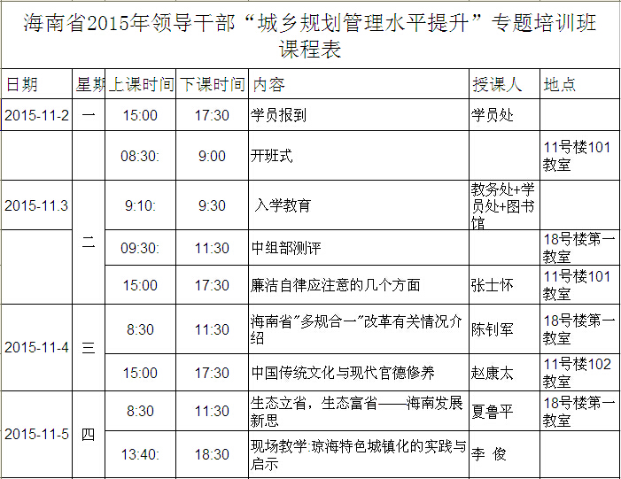 海南省2015年领导干部“城乡规划管理水平提升”专题培训班课程表